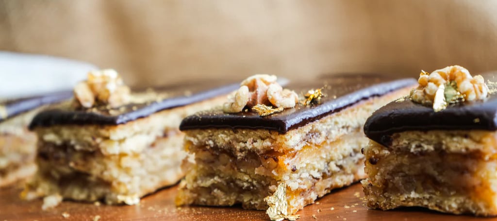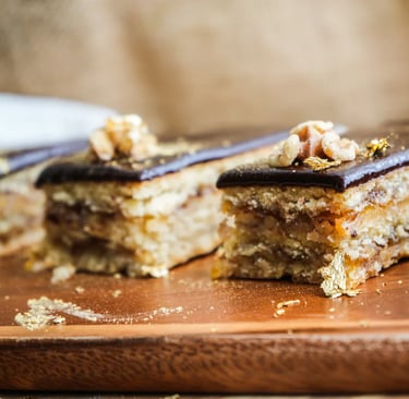 The house signature. A divine stack of yeast dough, ground walnuts, and apricot jam, topped with a chocolate glaze. It's Hungary on a plate—bold, nutty, a little tangy and unapologetically rich.