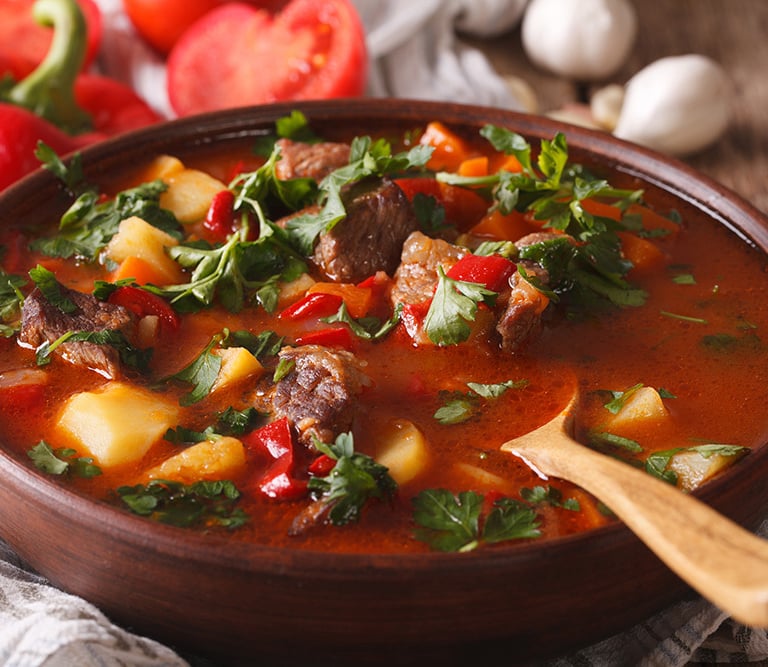 Gulyás (goulash) is the culinary soul of Hungary, a dish that has transcended the boundaries of cuisine to become a powerful national symbol, deeply tied to the land, the people, and the shared memory of the puszta (Hungarian plains). At its heart, gulyás is a rich meat stew or soup, traditionally made with marhahús (beef), burgonya (potatoes), sárgarépa (carrots), zeller (celery), and plenty of pirospaprika (sweet paprika), simmered together in a bogrács (cauldron) over an open fire. Its distinctive balance of smokiness, spice, and comfort makes it much more than a rural meal—it is a national treasure, representing Hungary’s historical connection to herding, open-air cooking, and the spirit of independence.